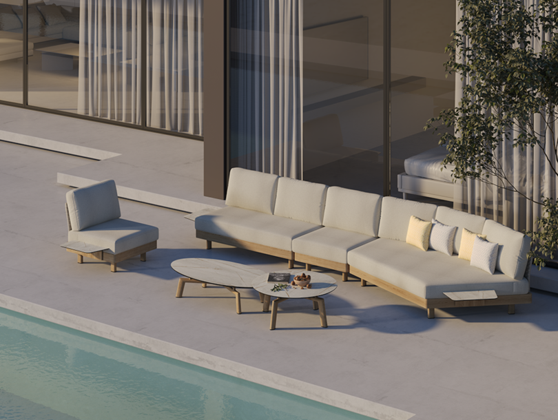 Its name is no coincidence. Deep cushions and generous proportions create a seating experience that feels supportive and soft, like a warm embrace. Clean lines ensure the look remains refined and contemporary. Available in anthracite and greige, the collection reflects a growing shift towards lighter outdoor tones that bring a sense of calm and openness to exterior spaces.