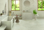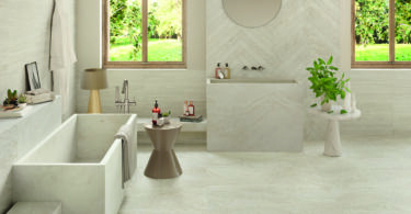 The Amazonia porcelain tile collection consists of four colour schemes, each including sub-colour schemes or textures. Amazonia Terracotta Plain has been combined with Amazonia Terracotta Tropic in this space. This combination was used as a focal point, alongside Amazonia Off-White, to make the room even more inviting.
