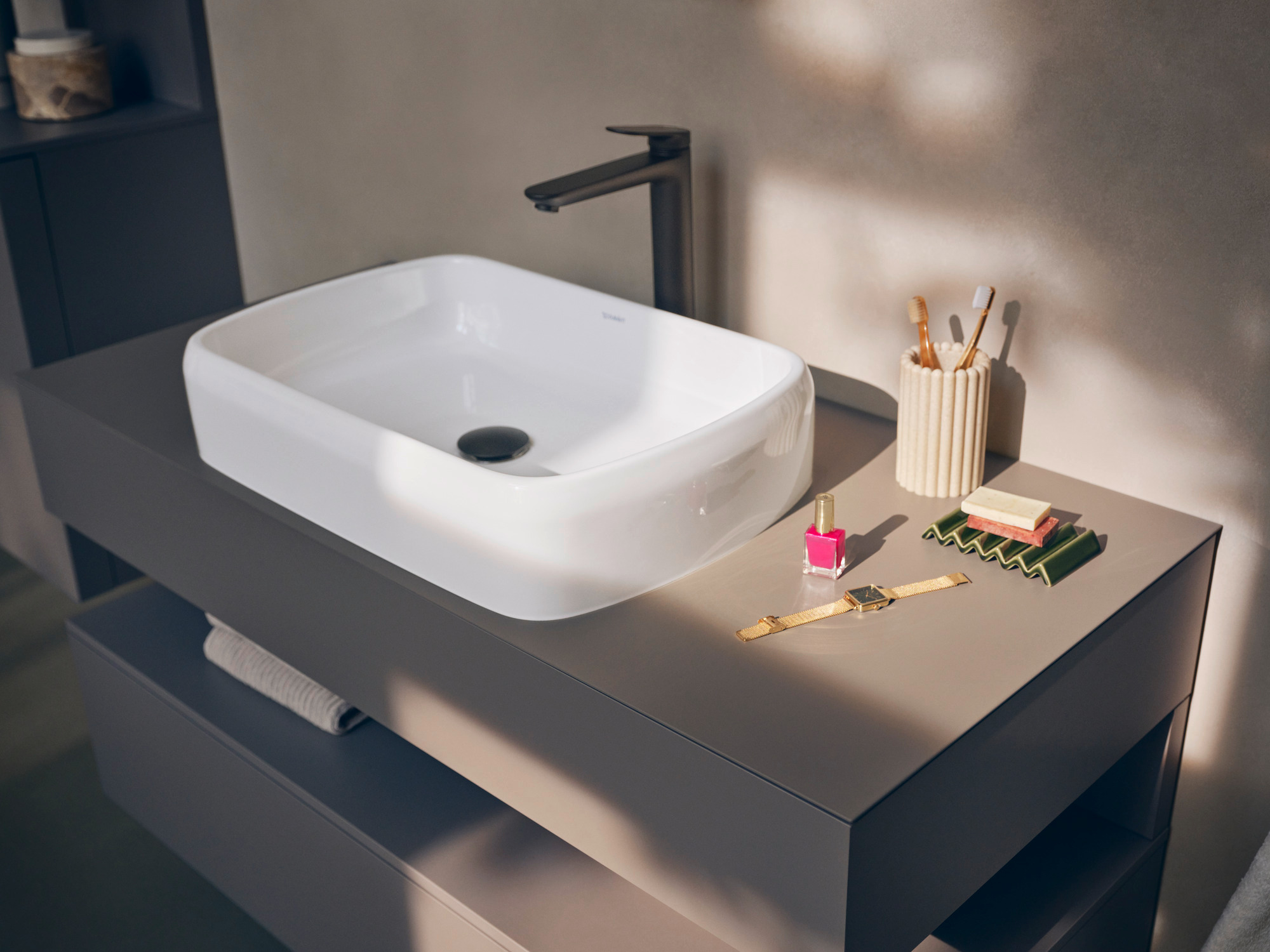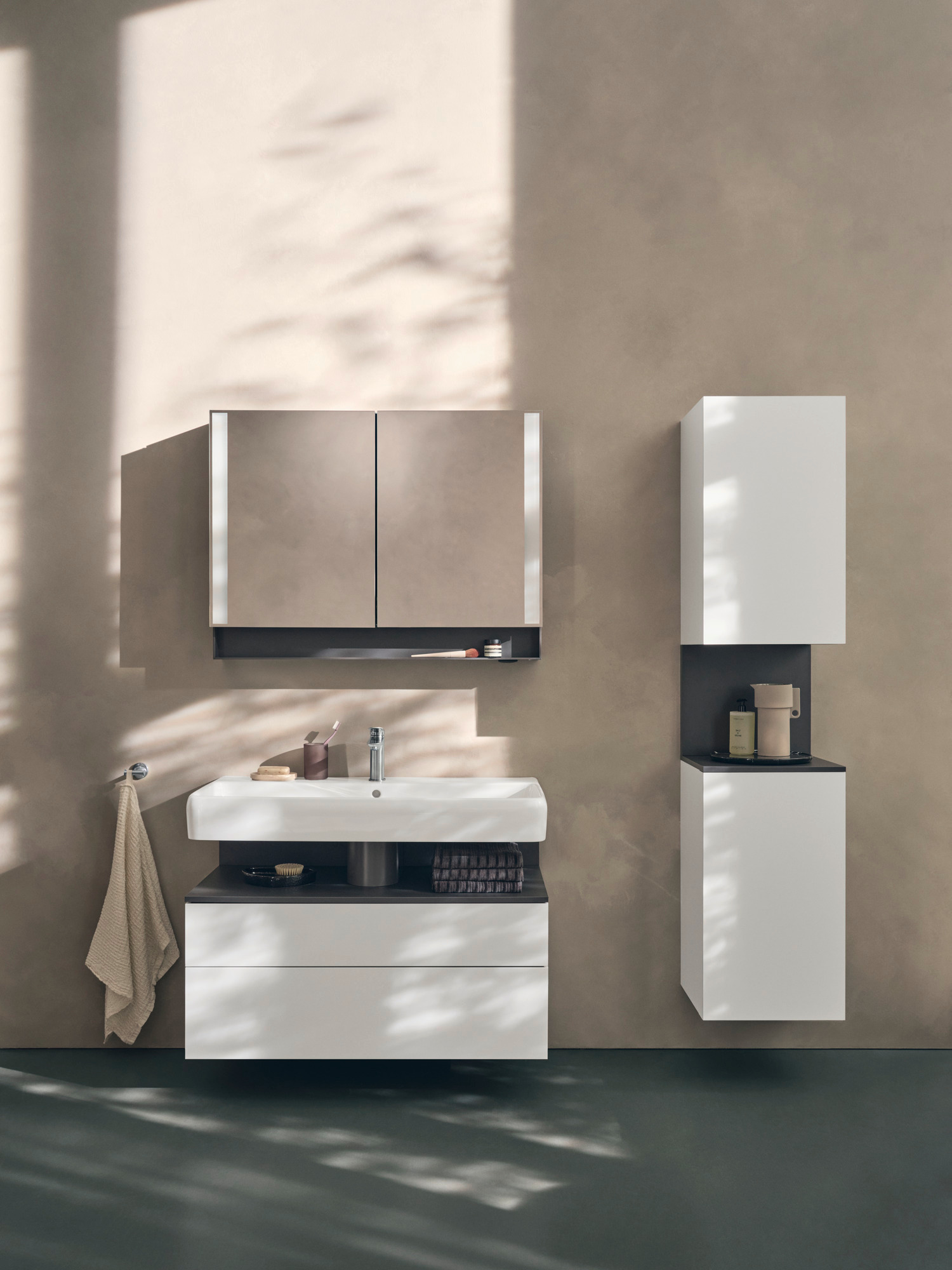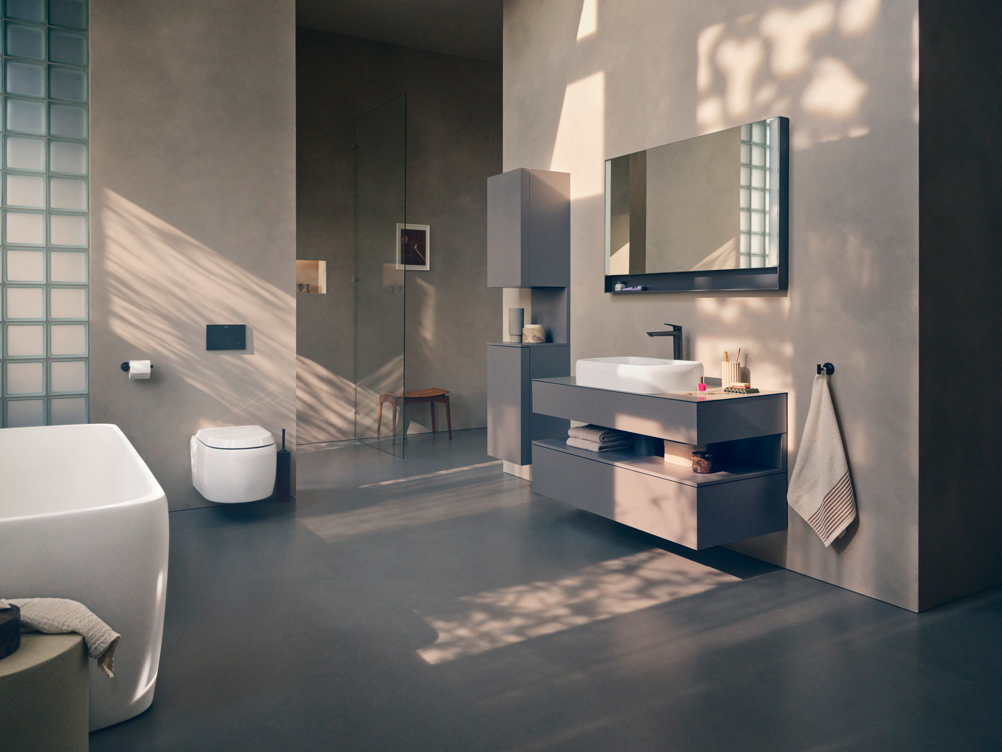 The muted centerpiece is the gently shaped above-counter basin – sensual in its contours, reserved in its expression. The floating, monochrome vanity unit creates visual calmness and functional clarity. Further, the mirror element with its open shelf and integrated lighting rounds off the ensemble around the washing area. The tall cabinet blends in elegantly to the side, offering space for personal items in the integrated niche.