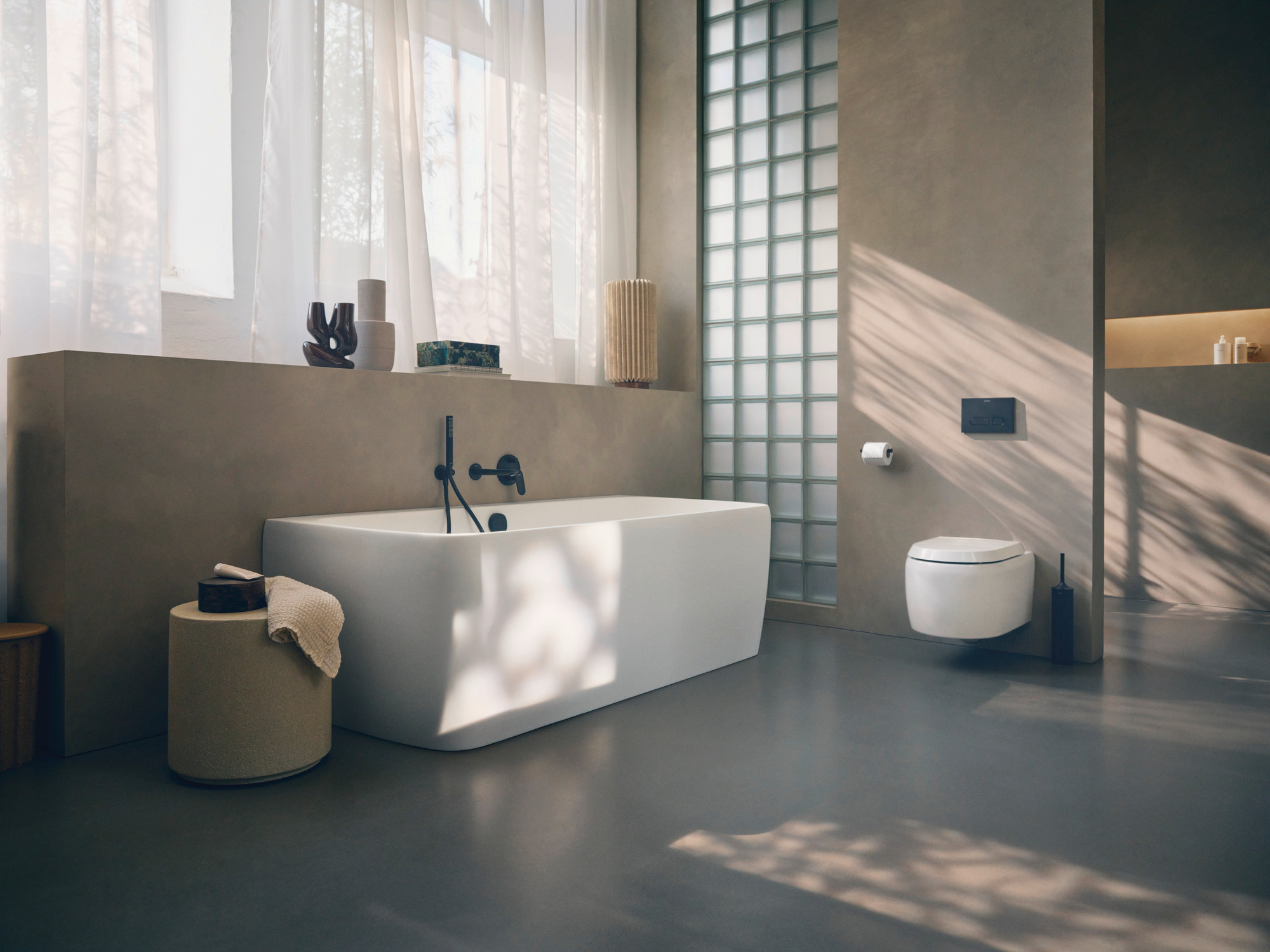 Positioned in front of a half-open wall, the bathtub continues the gentle formal language of the washbasin and creates a silent connection in the room. Black faucets and accessories create a continuous contrast that follows right through to the toilet flush plate.